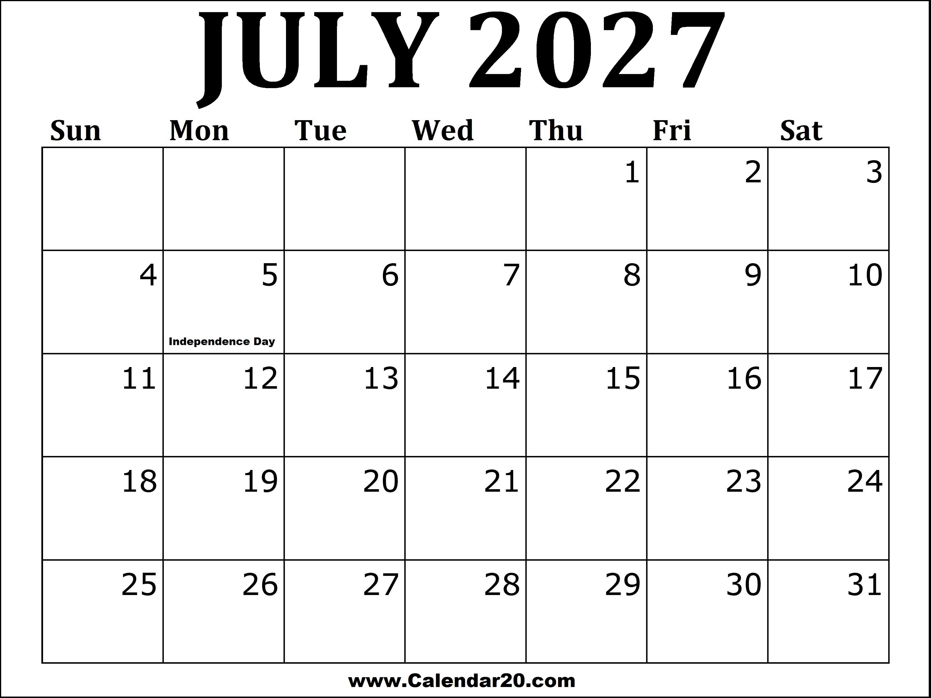 Horizontal Monthly July 2027 Calendar with United States holidays