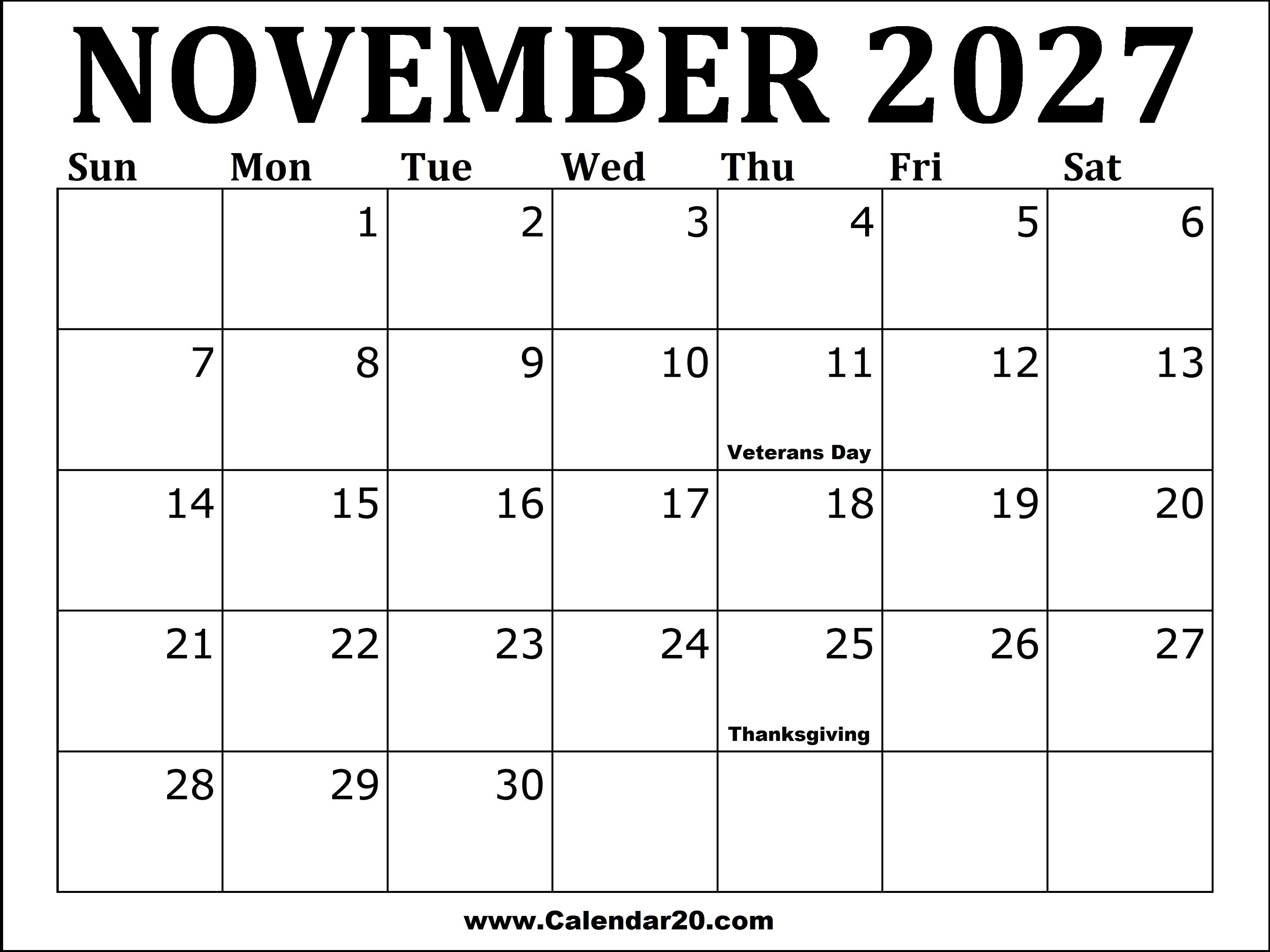 2027 November Calendar Printable with US holidays